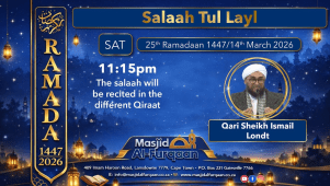 Masjid Al Furqaan Live Salaah Tul Layl by Qari Sheikh Ismail Londt - 25 Ramadaan 1447/14 March 2026